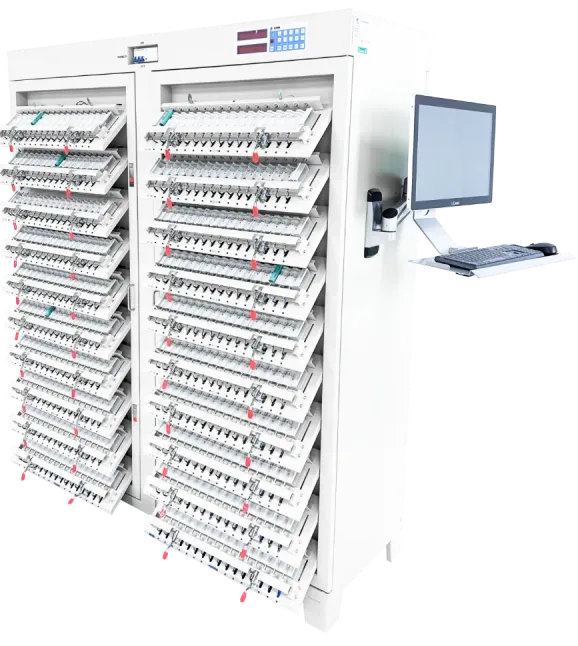 产线级电芯快速分选设备搭载了业内领先的电池机理数据孪生模型,针对商业锂离子/钠离子电芯,可实现分钟级的容量快 速检测、内阻检测和一致性分选。